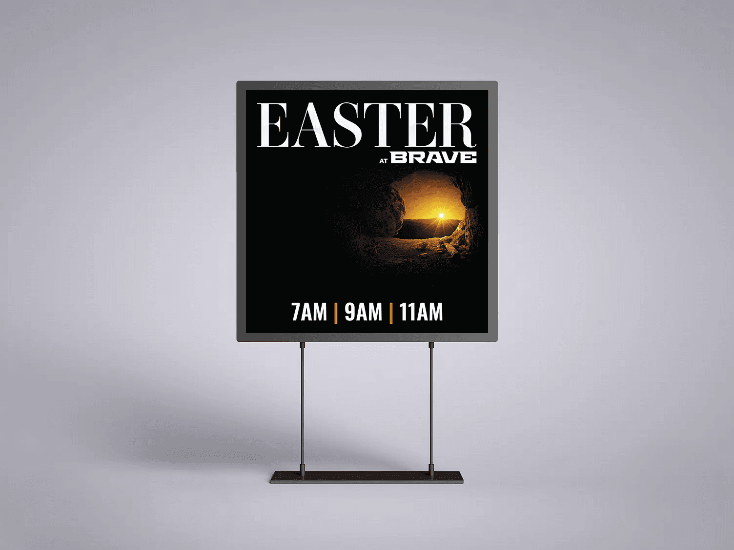 The primary challenge of the BRAVE Church Easter campaign was developing a visual theme that could translate seamlessly across a wide range of environments and platforms while also being executed within a very tight production timeline. Easter is one of the church’s most attended events of the year, requiring clear communication, strong visual impact, and a welcoming atmosphere for both regular attendees and many first-time guests. In addition to creating a compelling visual identity for the series, the design system had to function effectively across large-scale stage screens, digital platforms, and numerous printed materials including lobby signage, invitation cards, and exterior wayfinding. Each element needed to maintain visual consistency while also serving a clear functional purpose within the physical space. A key logistical challenge was ensuring that all signage and printed materials were designed, approved, and sent to production quickly enough to meet event deadlines. This required thoughtful prioritization of deliverables, efficient collaboration with team members, and careful preparation of print-ready files to ensure signage could be produced and installed in time for the event across multiple locations.